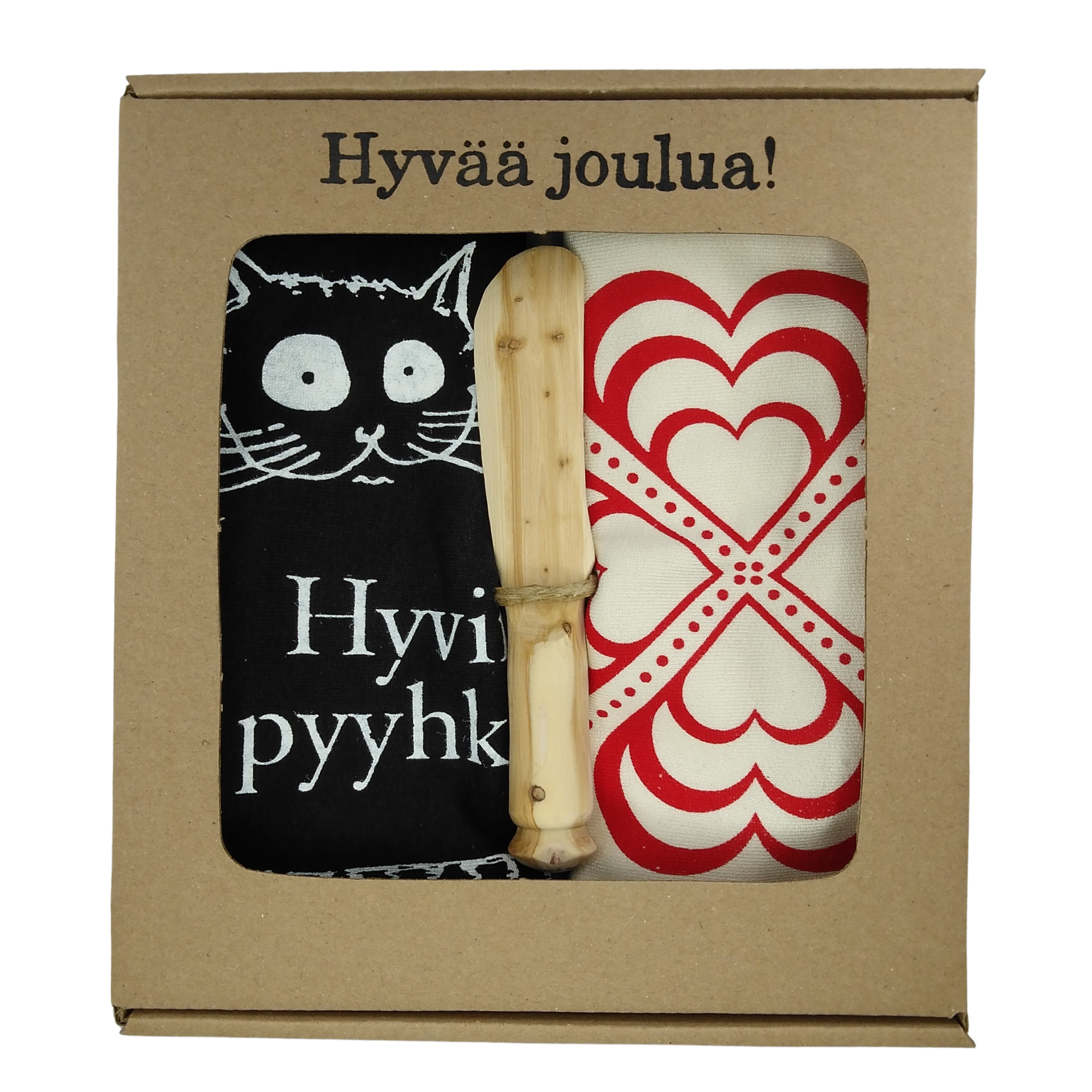 Lahjapakkaus sisältää kaksi Lempiriepu siivousliinaa, sekä katajasta valmistetun voiveitsen. Sisältää kuvan mukaiset liinat.