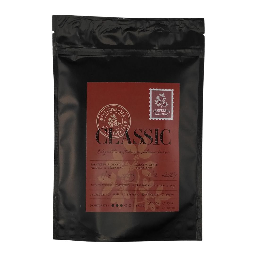 Classic on nimensä mukaisesti klassinen, pehmeä kahvi. Paahtoaste: 3/5Tampereen Paahtimon Classic syntyy Etelä- ja Väli-Amerikan kahvilaatujen sekoituksesta. Se sisältää ainoastaan käsin poimittuja ja pestyjä Arabica-papuja. Pakkauksen paino 200 grammaa. 100% käsityötä. Eettisesti tuotettua kahvia. Paahdettu Suomessa.