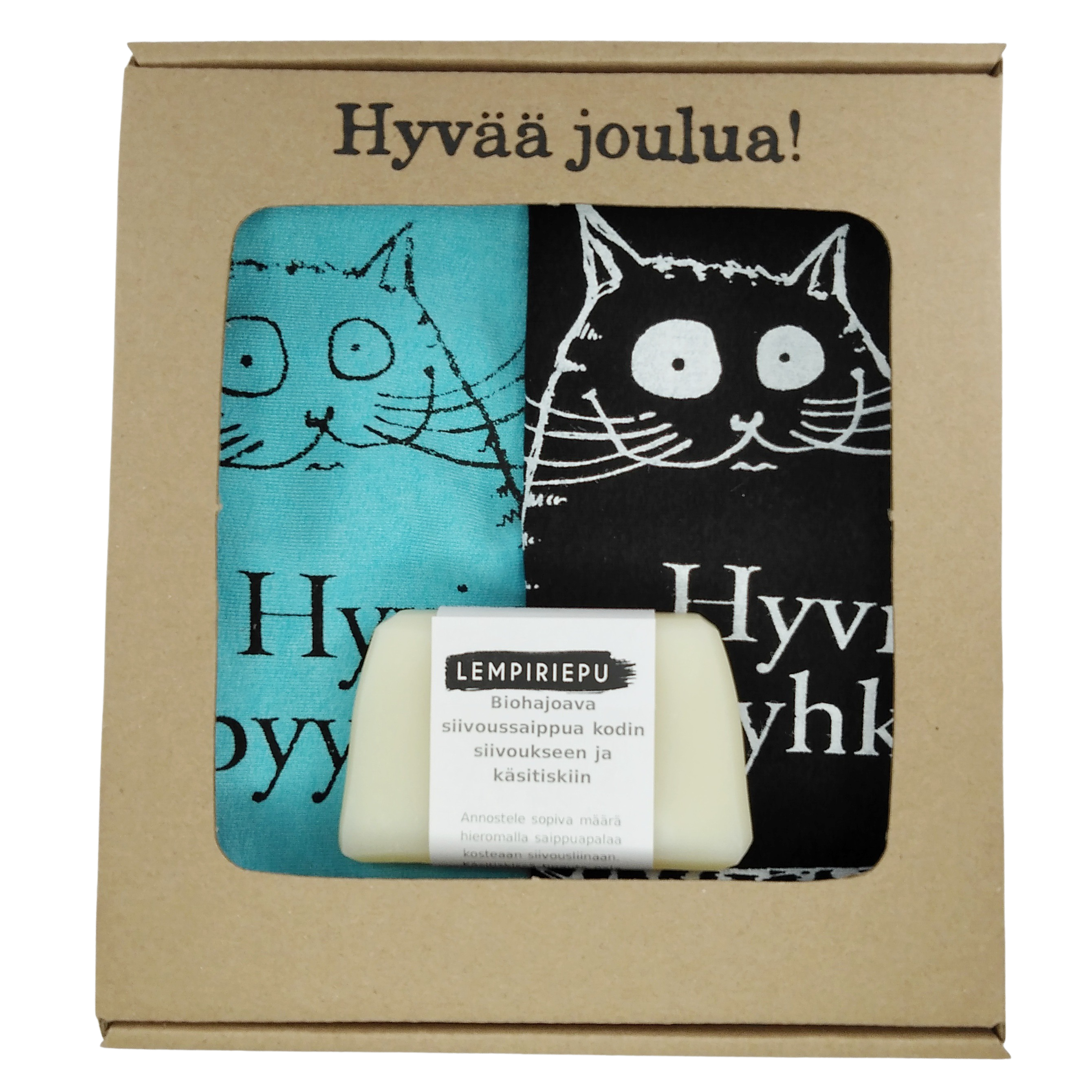 Lahjapakkaus sisältää kaksi Lempiriepu siivousliinaa, sekä siivoussaippuan. Sisältää kuvan mukaiset liinat.