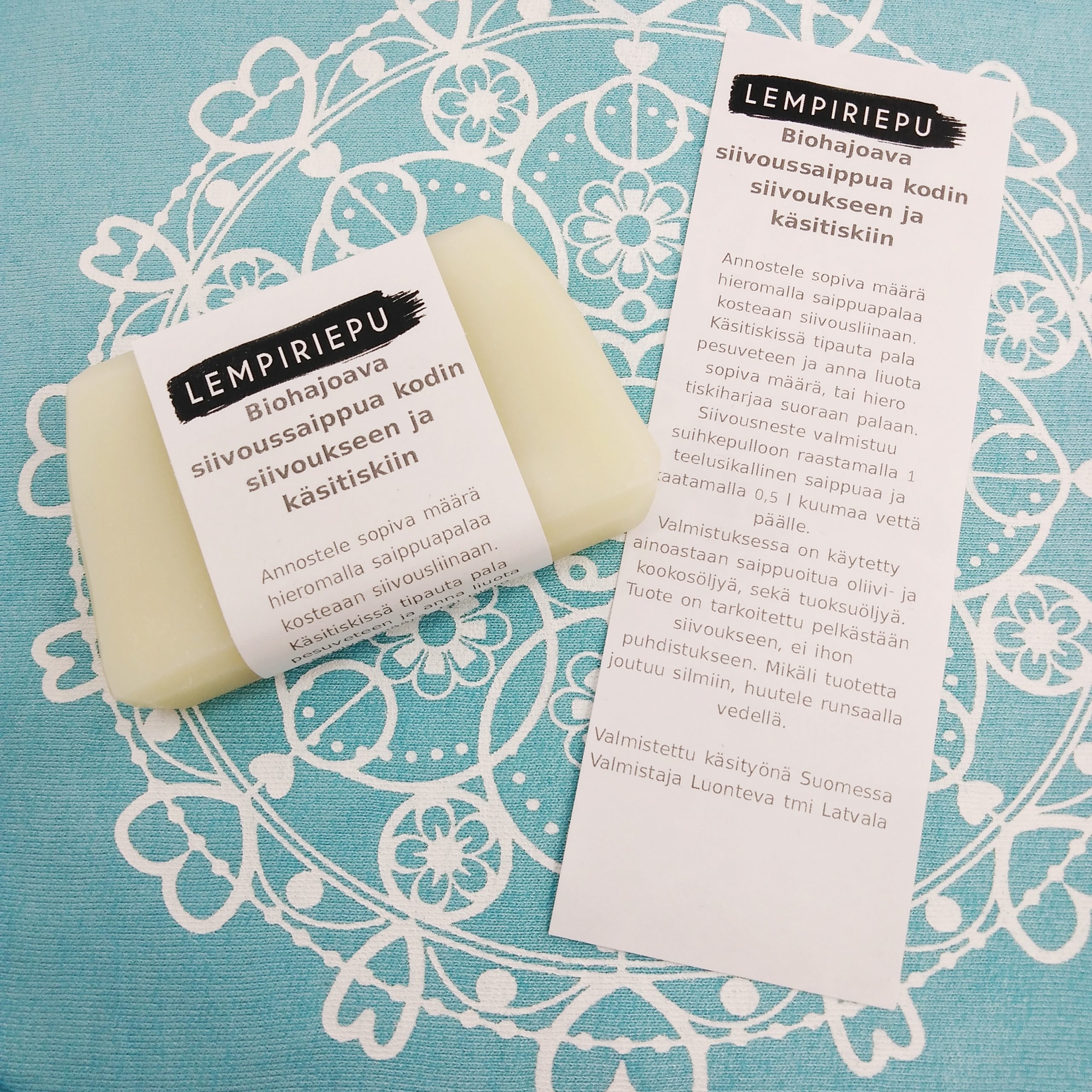 Biohajoava siivoussaippua kodin siivoukseen ja käsitiskiin. Annostele sopiva määrä hieromalla saippuapalaa kosteaan siivousliinaan. Käsitiskissä tipauta pala pesuveteen ja anna liuota sopiva määrä, tai hiero tiskiharjaa suoraan palaan. Siivousneste valmistuu suihkepulloon raastamalla 1 teelusikallinen saippuaa ja kaatamalla 0,5 l kuumaa vettä päälle.