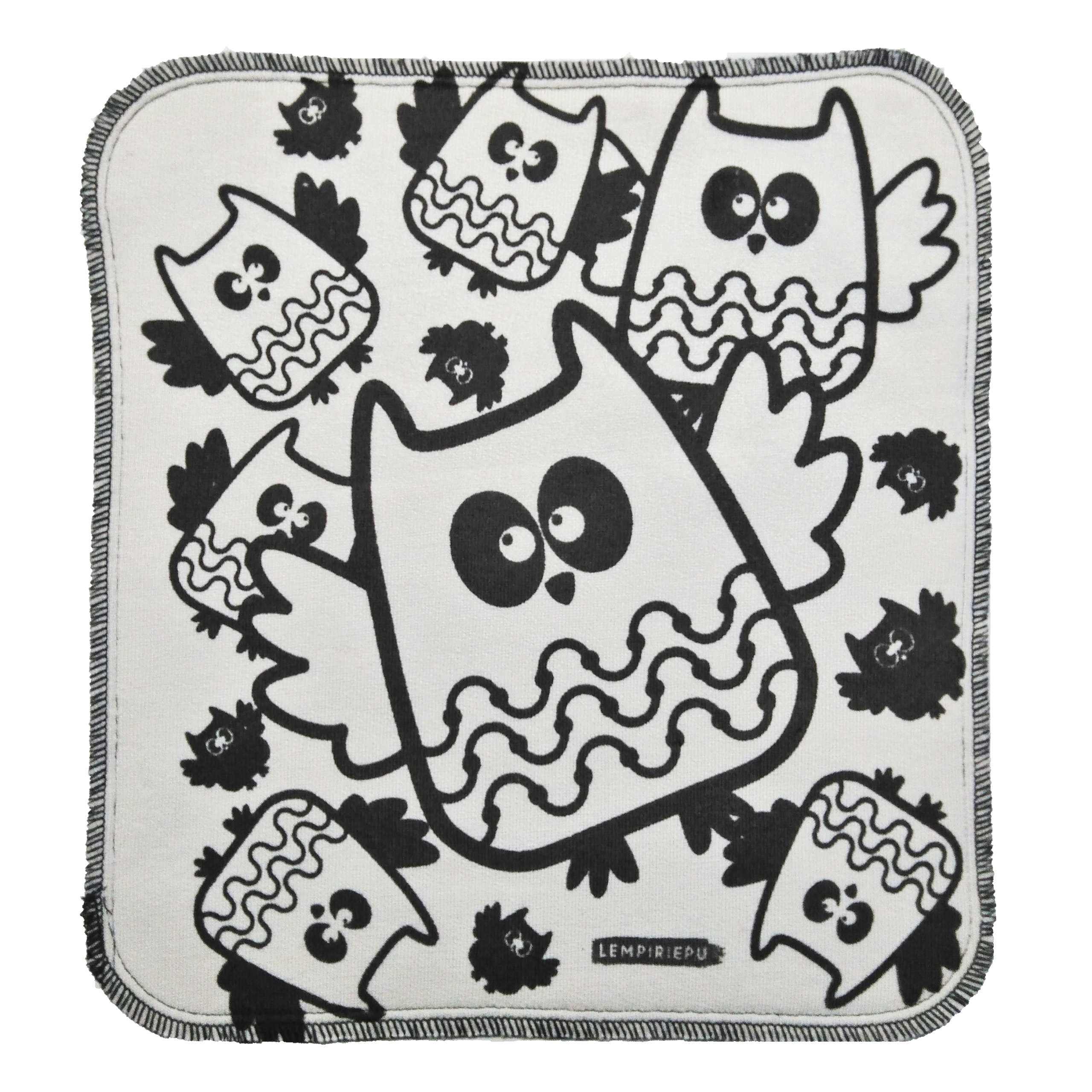 Lempiriepu siivousliina on kestävä ja pestävä bambuinen keittiöön ja siivoukseen sopiva liina, joka on kotimaista käsityötä. Pehmoinen kaksinkertainen bambutiskirätti on paitsi kaunis katsella, myös imee nestettä erittäin hyvin sekä kuivana että kosteana. Näissä rievuissa valkoinen yläpuoli on sileä pintainen ja musta alapuoli lenkkipinta. Pöllöt-kuosin on suunnitellut Susanna Mattheiszen.