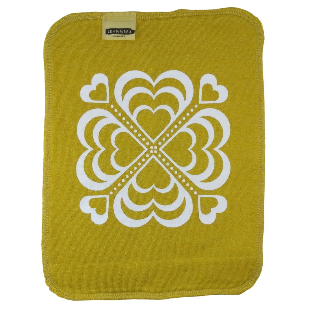 Lempiriepu siivousliina on kestävä ja pestävä bambuinen keittiöön ja siivoukseen sopiva liina, joka on kotimaista käsityötä. Pehmoinen kaksinkertainen bambutiskirätti on paitsi kaunis katsella, myös imee nestettä erittäin hyvin sekä kuivana että kosteana. Näissä rievuissa on sileä pinta kuvion puolella ja pehmeä froteemainen pinta toisella puolella.  Rakkaus-kuosin on suunnitellut Susanna Mattheiszen.